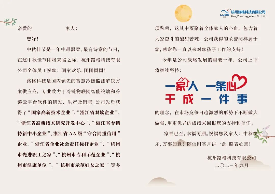 公司的發(fā)展離不開(kāi)全體員工的共同努力,也離不開(kāi)員工家屬在背后默默支持,大家才能全身心投入工作。在中秋佳節(jié)到來(lái)前,公司特意給員工家屬郵寄了悅滿中秋月餅禮盒以及一封家書,以此表達(dá)路格對(duì)各位家屬最真摯的節(jié)日問(wèn)候。