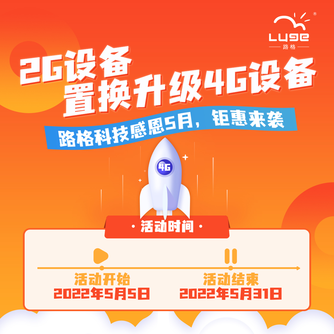 您好,依據工信部印發的《關于深入推進移動物聯網全面發展的通知》,全國各通信公司2G網絡將全面退網,為保證您的設備正常運作,請各用戶盡快將2G設備置換升級為4G設備。路格的成長,離不開老客戶的支持與厚愛,為回饋老客戶,公司特別推出“感恩5月,鉅惠來襲!”2G設備置換升級4G設備優惠活動,全國前200名更換客戶,可享受超值優惠升級政策,活動時間2022年5月5日~31日,活動詳情請咨詢銷售人員或當地代理商,全國24h服務熱線400-1188801。