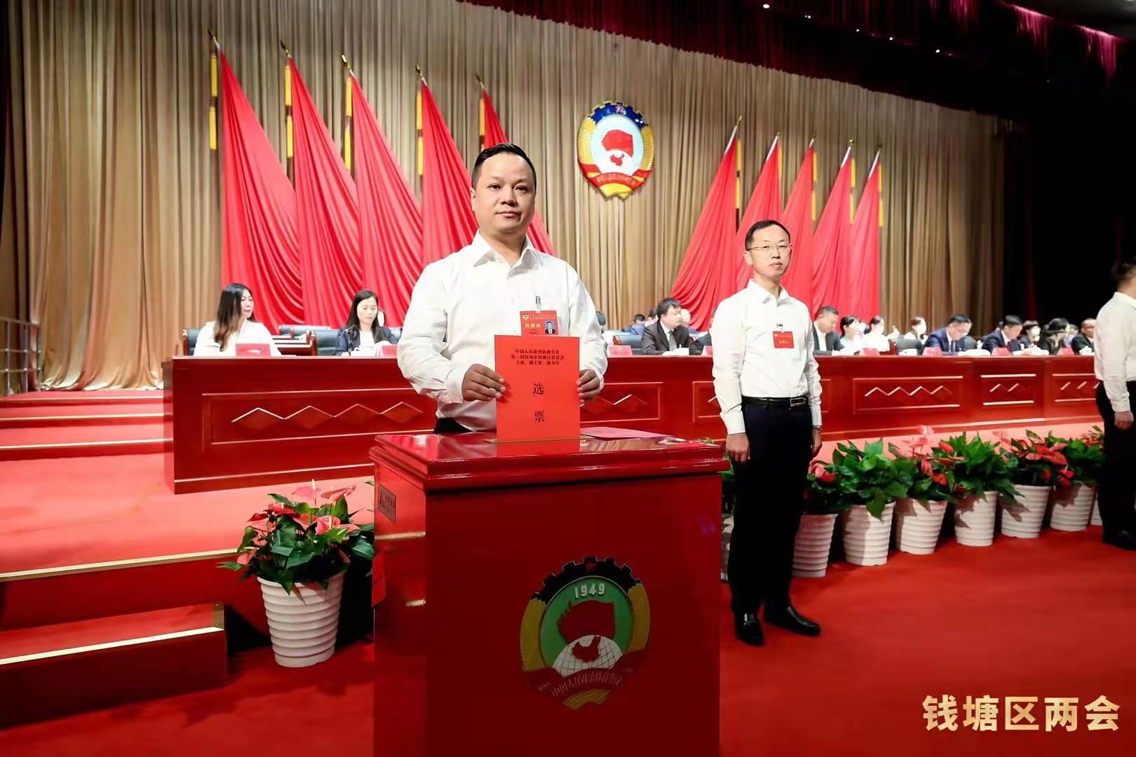 會議審議通過了選舉辦法;審議通過了總監票人、副總監票人、監票人名單。會議以無記名投票方式,選舉產生了政協第一屆杭州市錢塘區委員會主席、副主席、秘書長、常務委員。我司總經理何望君作為經濟界政協委員投出了自己神圣的一票。