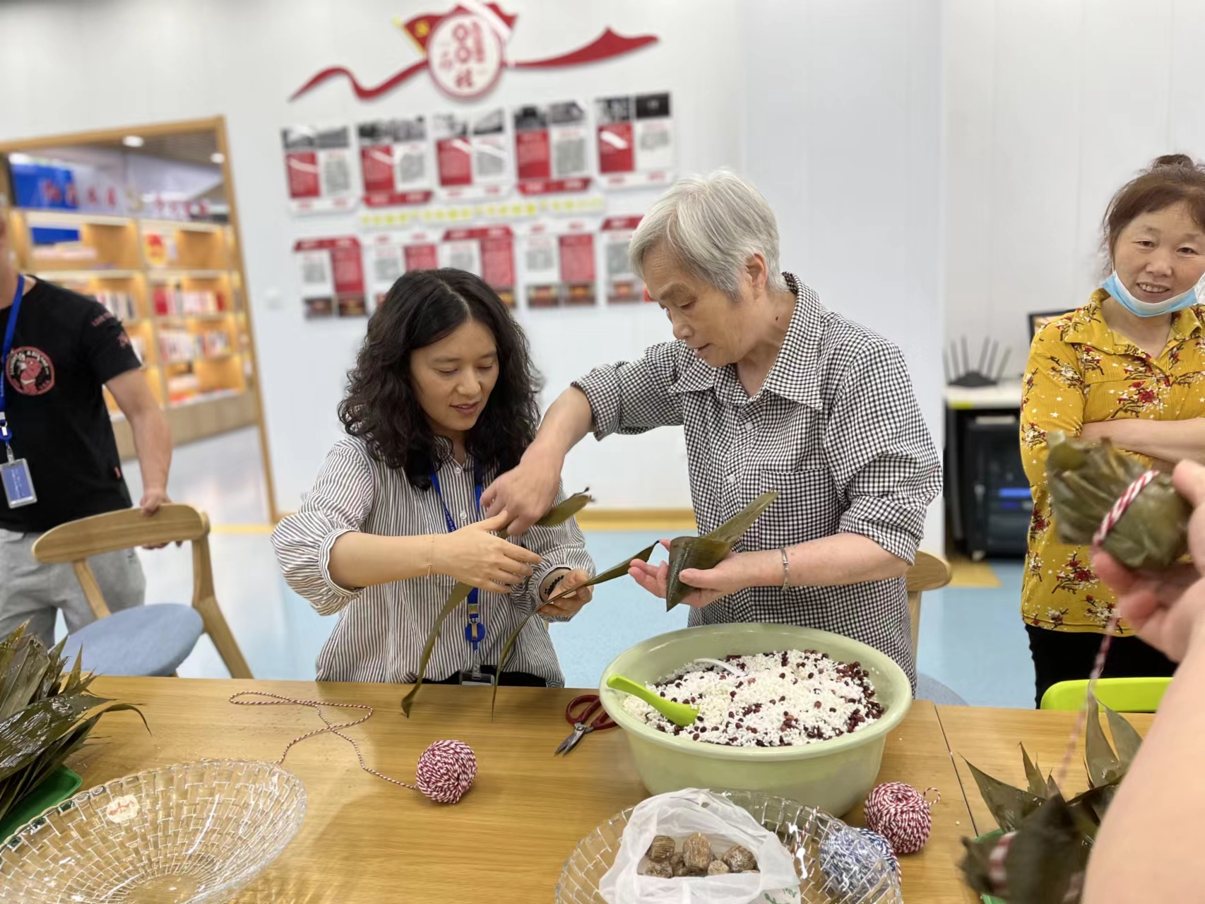 工會委員將精心準備的糯米、蜜棗、紅豆、竹葉、繩子等必備材料擺上桌子后,來自各個部門的職工和媽媽們一起興致盎然地包起粽子,大家分工合作,不會包的“打下手”,會包的“教徒弟”,大家歡聲笑語一起動手,互相交流著包粽子的技巧。經過大家的努力,糯米、紅棗、豆沙、竹葉瞬間變成了一個個滿懷情義的粽子。