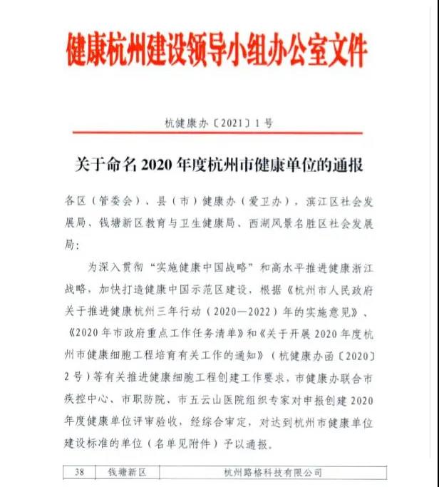 經我司積極申報,由杭州市健康辦聯合市疾控中心、市職防院、市五云山醫院組織專家的評審、驗收,經綜合評定,杭州路格科技有限公司獲評2020年度杭州市健康單位。