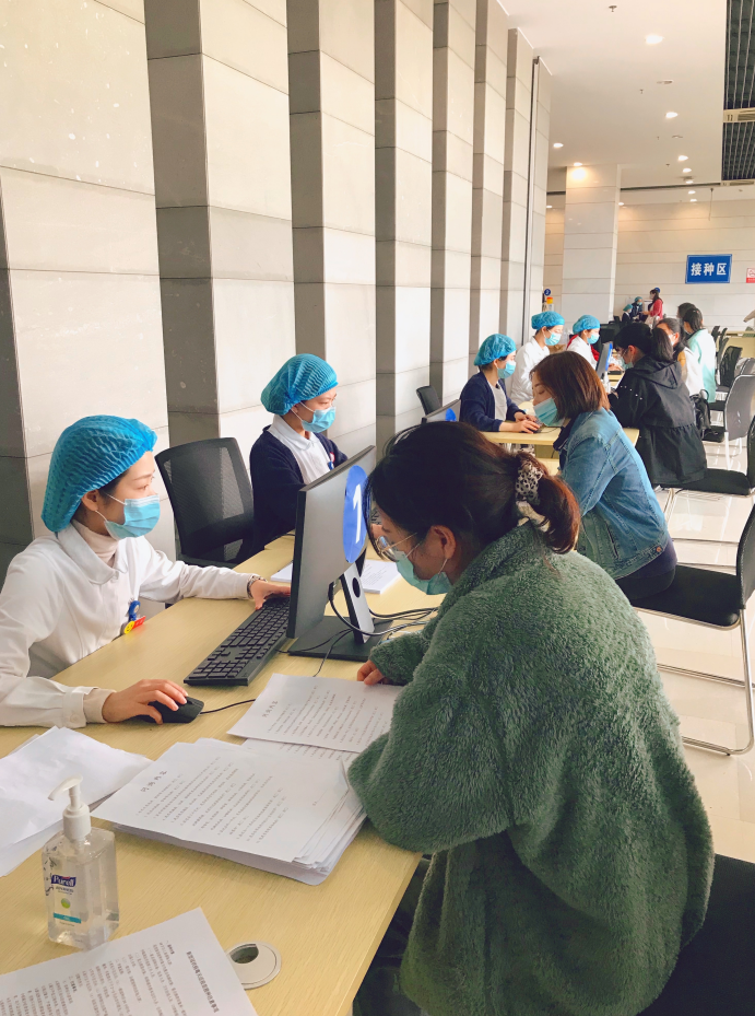 (我司員工在登記信息,認真閱讀接種注意事項)