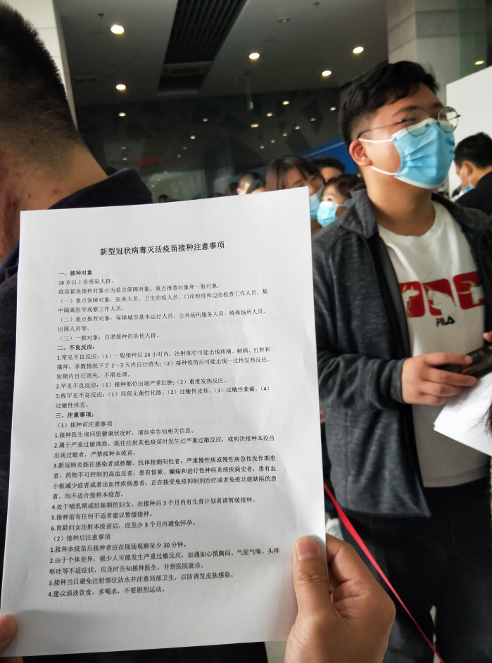 到達接種地點后我公司員工主動配合現場工作人員,井然有序的排隊領取問詢表和接種注意事項表,登記信息進行疫苗接種。