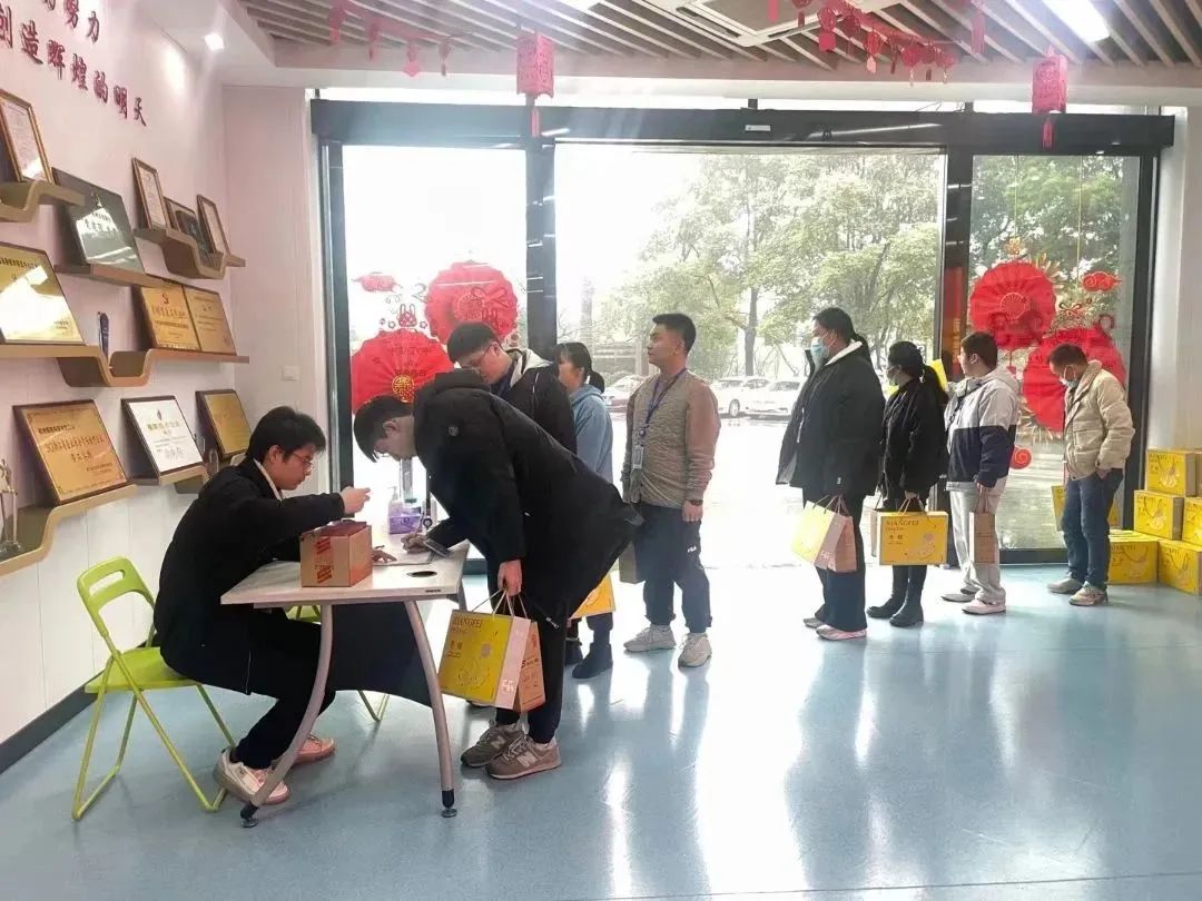 年貨發放現場氣氛熱烈,隨處可見你來我往、互相幫忙分發的情景,到處洋溢著溫馨和諧的喜慶氣氛。一份份年貨送到了每一位家人們人手中,同時送去了公司最真誠的問候和祝福。