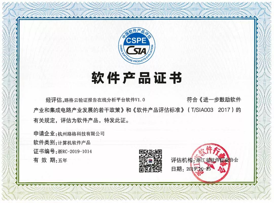 為了積極開拓軟件市場,加強公司知識產權保護。經浙江省軟件行業協會審核,我公司自主研發的 《路格云驗證報告在線分析平臺軟件V1.0》和《路格云信平臺軟件V1.0》的軟件產品,符合《進一步鼓勵軟件產業和集成電路產業發展的若干政策》和《軟件產品評估標準》的相關要求,特頒發《軟件產品登記證書》。