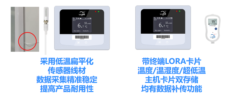 有線傳感器采用低溫扁平化傳感器線材,數據采集精準穩定,提高產品耐用性;無線LORA卡片支持溫度/溫濕度、超低溫,主機卡片雙存儲,均有數據補傳功能。