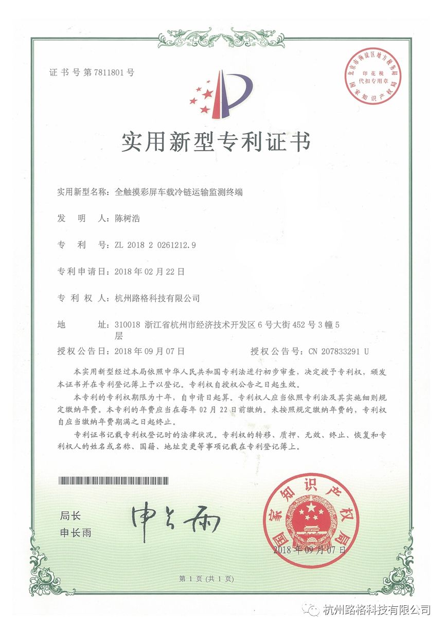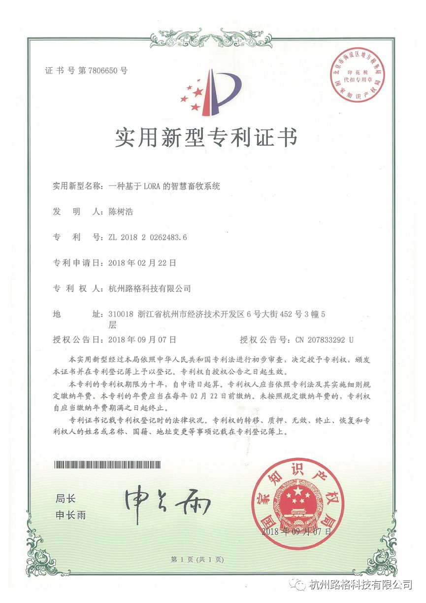 經企業申報、材料審查和審查員授權,我公司于2018年9月順利取得“全觸摸彩屏車載冷鏈運輸檢測終端”、“旅行式多參數智能環境采集箱”、“一種基于LORA的智慧畜牧系統”三項實用新型專利證書。